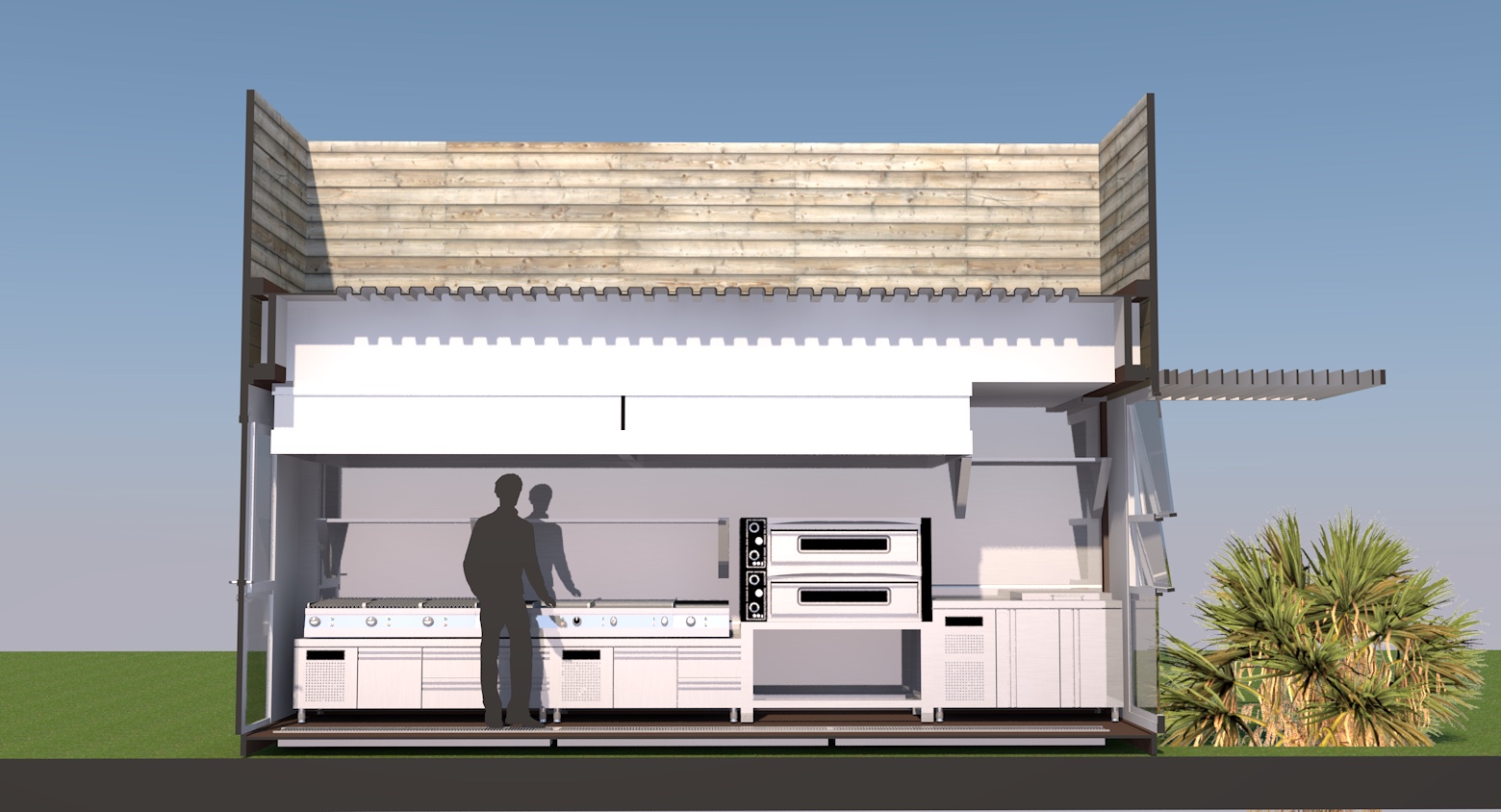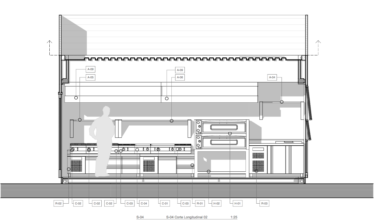 Proyecto de Restaurant en respuesta al reto de resolver una cocina operativa para atender servicio de Pizzería, Cachapas y Parrillas, hemos logrado sortear las limitaciones espaciales, técnicas y constructivas sin dejar de lado la estética del contenedor móvil equipado. El diseño de Cocina pequeña siempre es un reto, afortunadamente contamos con el proveedor y las marcas adecuadas de equipos para llegar a la mejor solución.