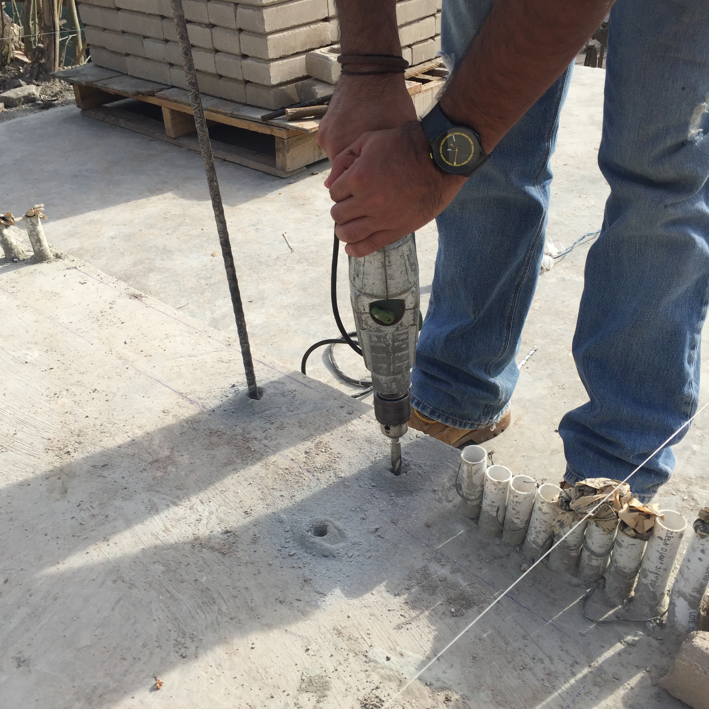 Al fin se lograron superar las fallas y se ha retomado el ritmo, la planta recibió materia prima y en la obra recibimos el primer despacho de ladrillos, lo que nos permitió en los últimos días el replanteo de la comprometida primera hilera, sin duda una actividad clave en el proceso constructivo de nuestro sistema.